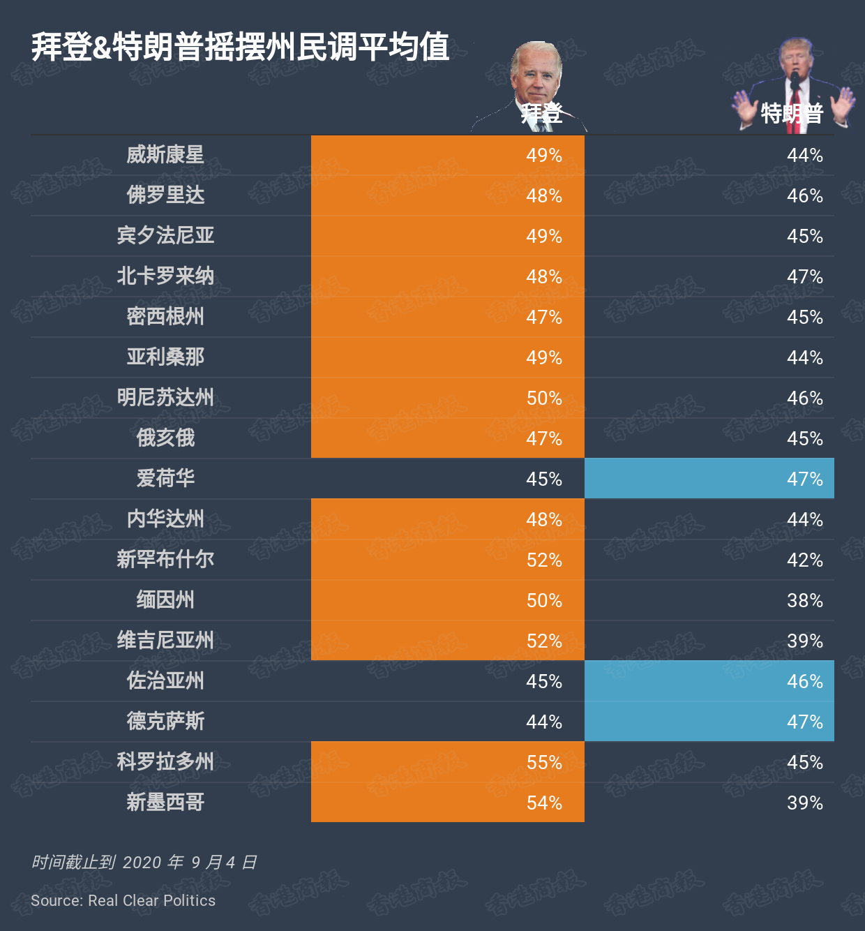从目前的民调数据来看,拜登在14个摇摆州中的支持率领先,而特朗普在爱荷华,佐治亚州,德克萨斯州中的支持率要高於拜登,但差距也仅为1-3个百分点,选情十分胶着。