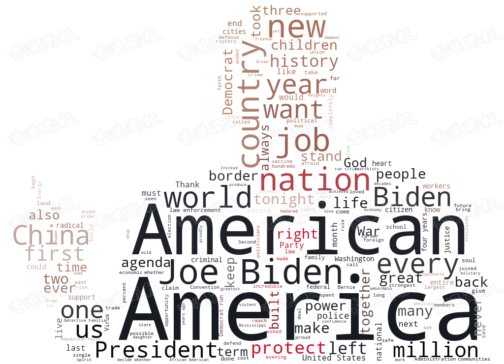 特朗普的演讲全程70分钟,从上述词雲图可以看出,除美国外,多次提到拜登的名字,称拜登可能是美国的毁灭者。他还提到了25次工作(job),15次中国(China)以及保护(protect)等词汇。特朗普在演讲中不忘抹黑中国,称「我们正在击退从中国传来的可怕东西(新冠病毒)」。而对於美国疫情导致数百万人失业的事实,特朗普却宣称「我们过去三个月创造了900多万个工作岗位」,整篇演讲稿颂扬自己所做的贡献以及抹黑拜登。