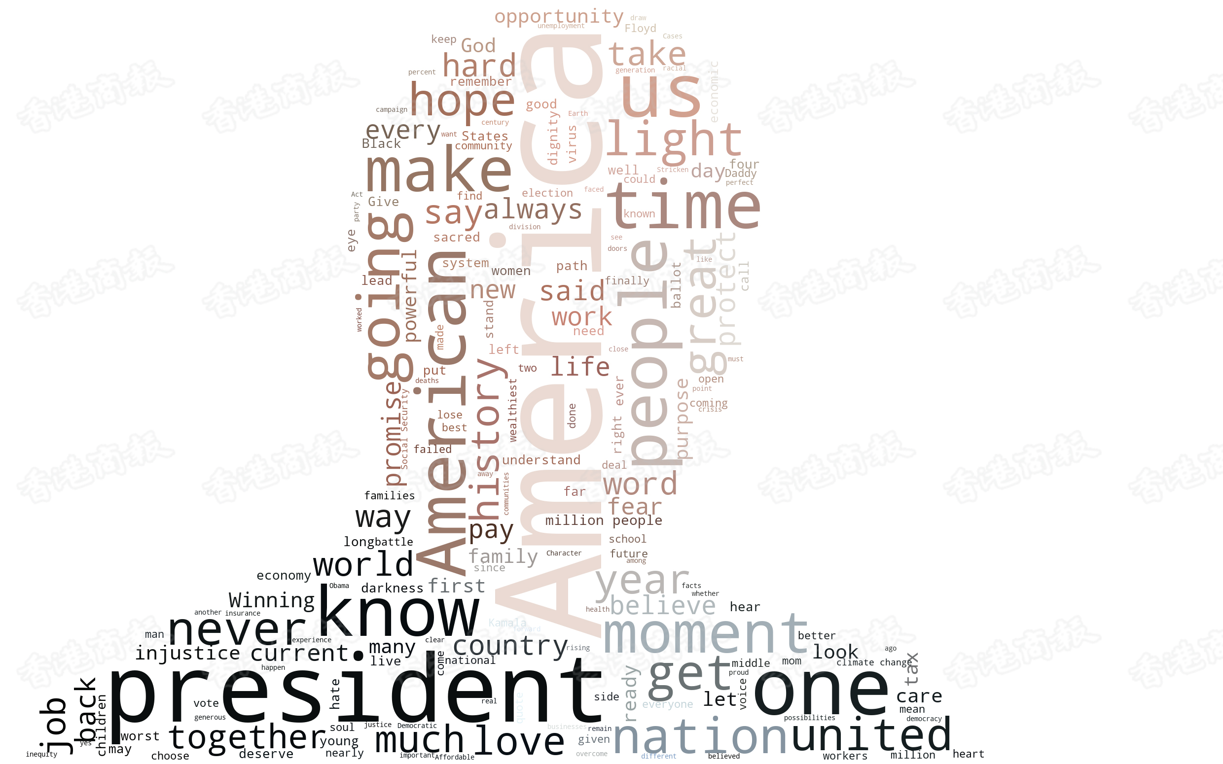 而拜登的演讲全程历时25分钟,从上述词雲图可以看出,同样除美国外,拜登提到了希望(hope),爱(love),人民(people),经济(economy)等词汇。当然他同样也提及了12次特朗普,在演讲稿中以美国现总统代指特朗普,他指责「现总统让美国陷入黑暗太久了」,同时他的演讲聚焦在特朗普政府应对新冠疫情的措施上,并说到病毒消失的奇迹不会来临,如果他当选为总统,会颁布一系列的措施来拯救美国,而他的这些措施中也包括了对就业机会的计划。