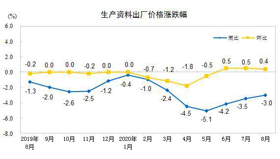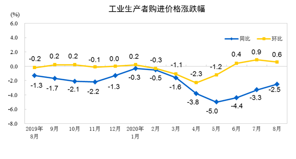 2020年8月份,全國工業生產者出廠價格同比下降2.0%,環比上漲0.3%;工業生產者購進價格同比下降2.5%,環比上漲0.6%。1―8月平均,工業生產者出廠價格比去年同期下降2.0%,工業生產者購進價格下降2.7%。