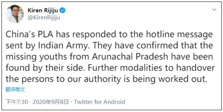 这名印度官员9月8日在Twitter上表示,中国人民解放军通过热线告诉印度军方,已经在中方一侧找到了5名据称在9月2日「失踪」的印度村民,目前中印双方正在协商如何交接。