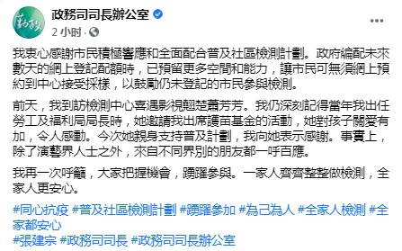 本港新冠肺炎疫情持續,截至今日(9日)中午前,約125.6萬人經網上登記參與普及社區檢測計劃。政務司司長張建宗今日在社交平台上表示,感謝市民積極響應,政府編配未來數天的配額時,已經預留更多空間和能力,讓市民可無須網上預約到中心接受採樣,以鼓勵仍未登記的市民參與檢測。他再次呼籲市民把握機會,踴躍參與。一家人齊齊整整做檢測,全家人更安心。