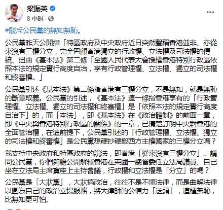 梁振英指出,公民黨引述《基本法》第二條指香港有三權分立,不是無知,就是無恥的斷章取義。公民黨的引述,《基本法》這一條指香港享有的「行政管理權、立法權、獨立的司法權和終審權」是「依照本法的規定實行高度自治下」的,而「本法」,即《基本法》在《政治體制》的前面一章,即《中央與香港特別行政區的關係》的一章,已清楚訂明中央對香港的全面管治權,在這前提下,公民黨引述的「行政管理權、立法權、獨立的司法權和終審權」是公民黨想硬抄硬搬西方主權國家的三權分立嗎?