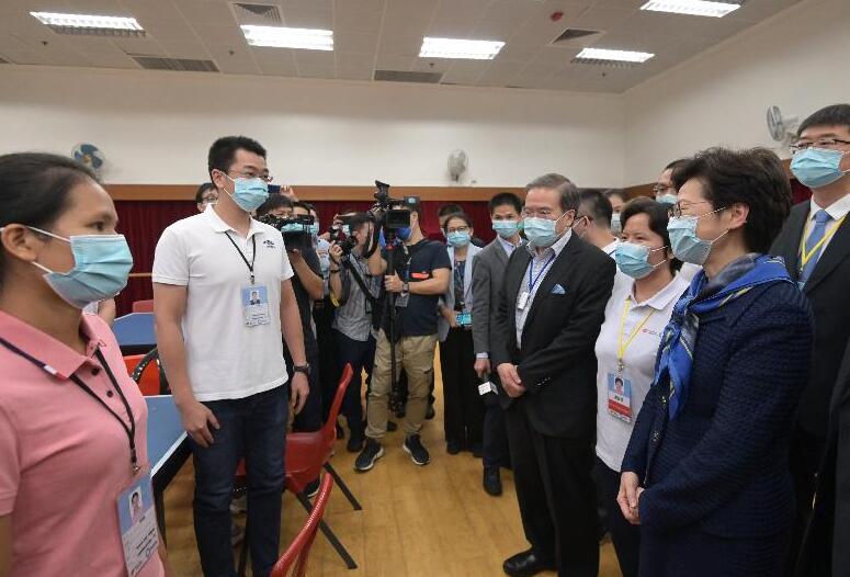 行政長官林鄭月娥今日(9日)傍晚與公務員事務局局長聶德權、食物及衞生局局長陳肇始教授和政制及內地事務局局長曾國衛,到訪設於中西區中山紀念公園體育館的臨時氣膜實驗室,了解實驗室的運作情況,並為工作人員打氣。