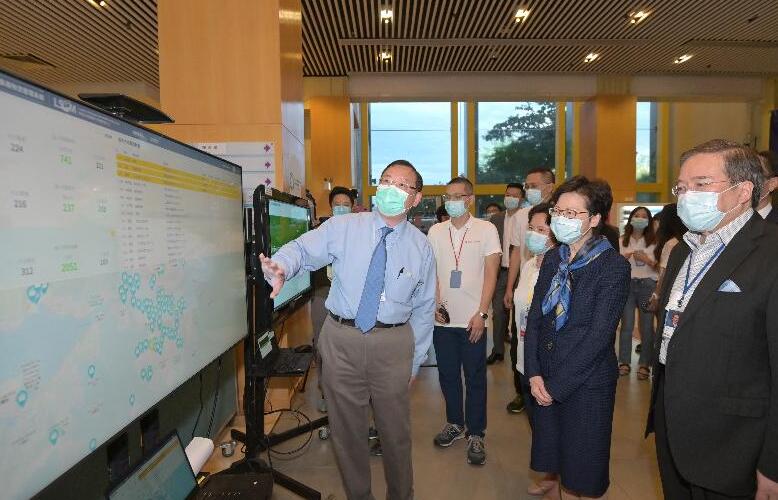 林鄭月娥繼上月底視察當時剛準備就緒的臨時氣膜實驗室後,今日再次到訪,了解其實際運作情況。她聽取負責實驗室運作的華昇診斷中心董事長胡定旭介紹人手安排和工作流程,亦聽取物流及供應鏈多元技術研發中心行政總裁黃廣揚介紹如何運用科技理順物流安排,確保樣本每日從社區檢測中心安全和準時送抵實驗室。該中心月前亦為政府研發和生產用於家居檢疫的電子手環的工作,林鄭月娥讚揚團隊積極參與抗疫工作,貢獻良多。
