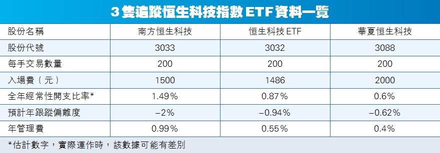 指數ETF的好處是入場費相對較低,相比大型科技股動輒過萬元的入場費,指數ETF千多元就能入市,捕捉科技股升勢,以一籃子形式代替逐隻挑選科技股。3隻ETF的資產均追蹤恒生科技指數表現,理論上應沒有分別,唯一最大區別除了每手入場費不同,還有ETF管理費、全年經常開支比率等,這些都可能影響ETF的投資成本和回報,從而影響ETF交易價格。