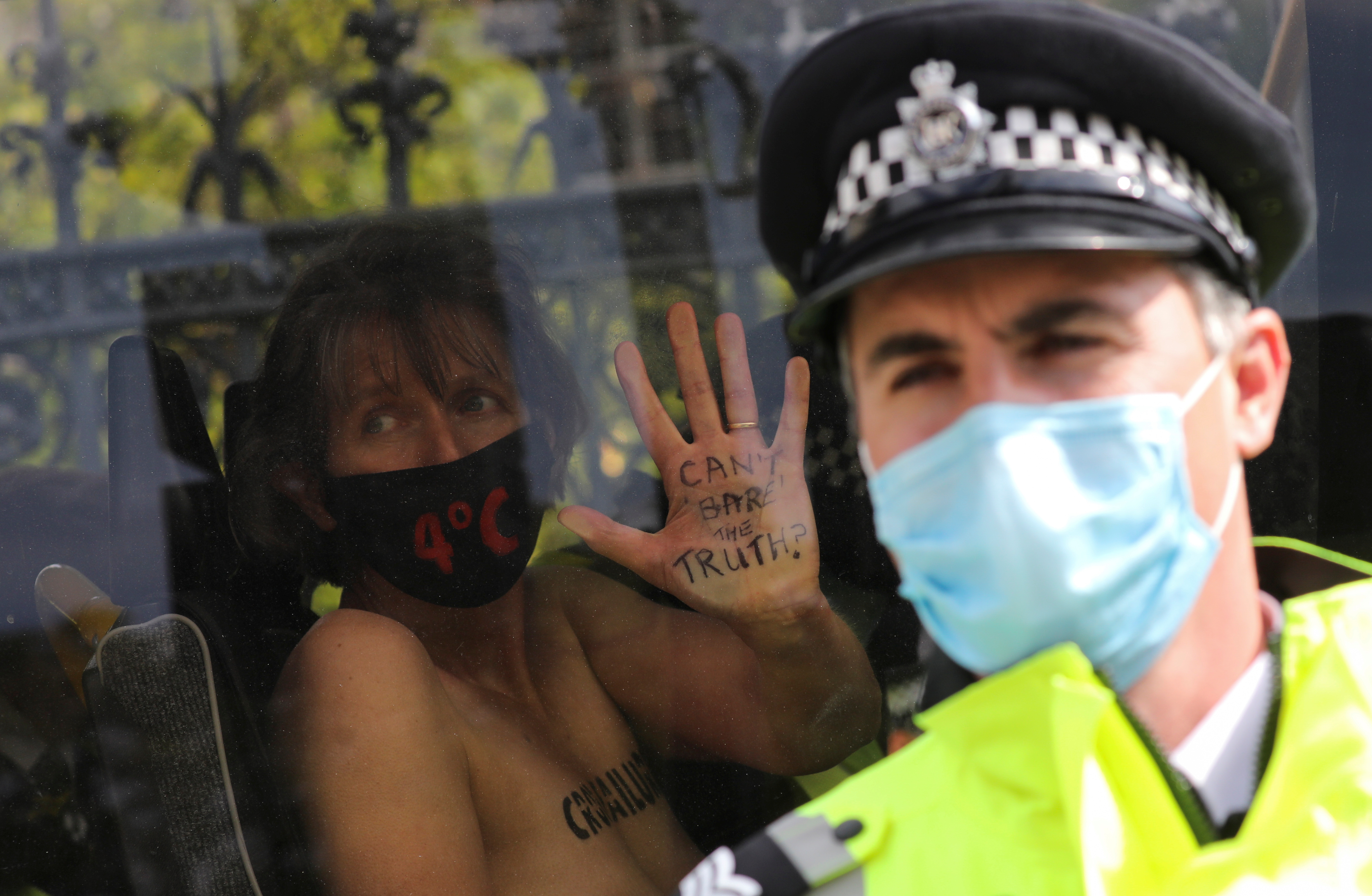 英國抗議團體「反抗滅絕」30名女示威者,周四在倫敦的國會大樓外脫光上衣抗議,要求當局採取行動對抗氣候暖化。她們手持大型橫額,又將氣候暖化的後果,包括戰爭、飢荒等字句寫在胸口上,部份人用單車鎖將自己的頸部鎖在鐵道上。她們指,如果全球多國不採取行動,全球平均氣溫會在2100年前上升攝氏4度。