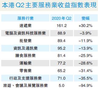 政府統計處昨日發表的業務收益指數臨時數字顯示,2020年第二季與2019年第二季比較,大部分的主要服務行業(以價值計算)的業務收益均有不同程度的跌幅。跌幅最高的是住宿服務業,下跌71%。