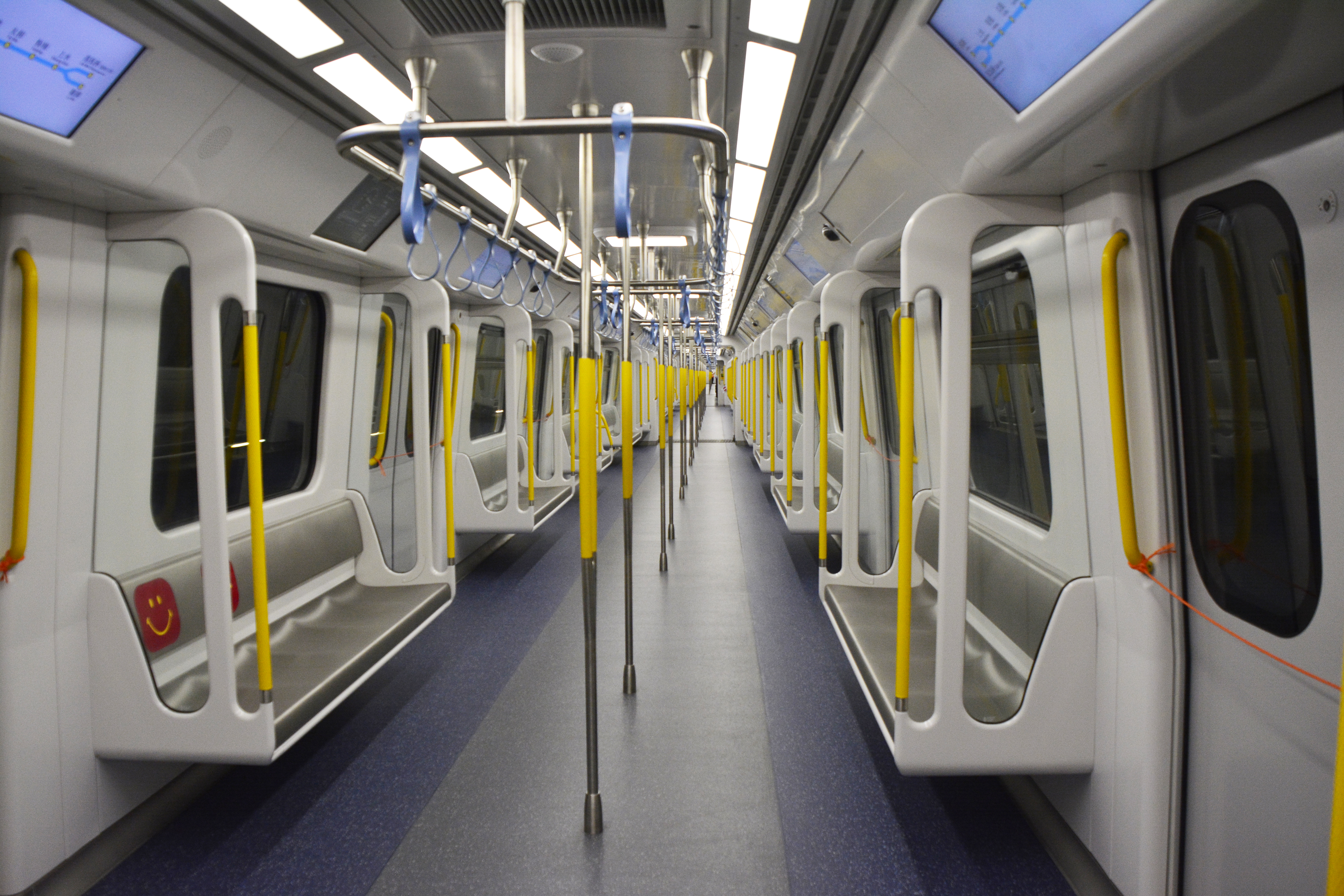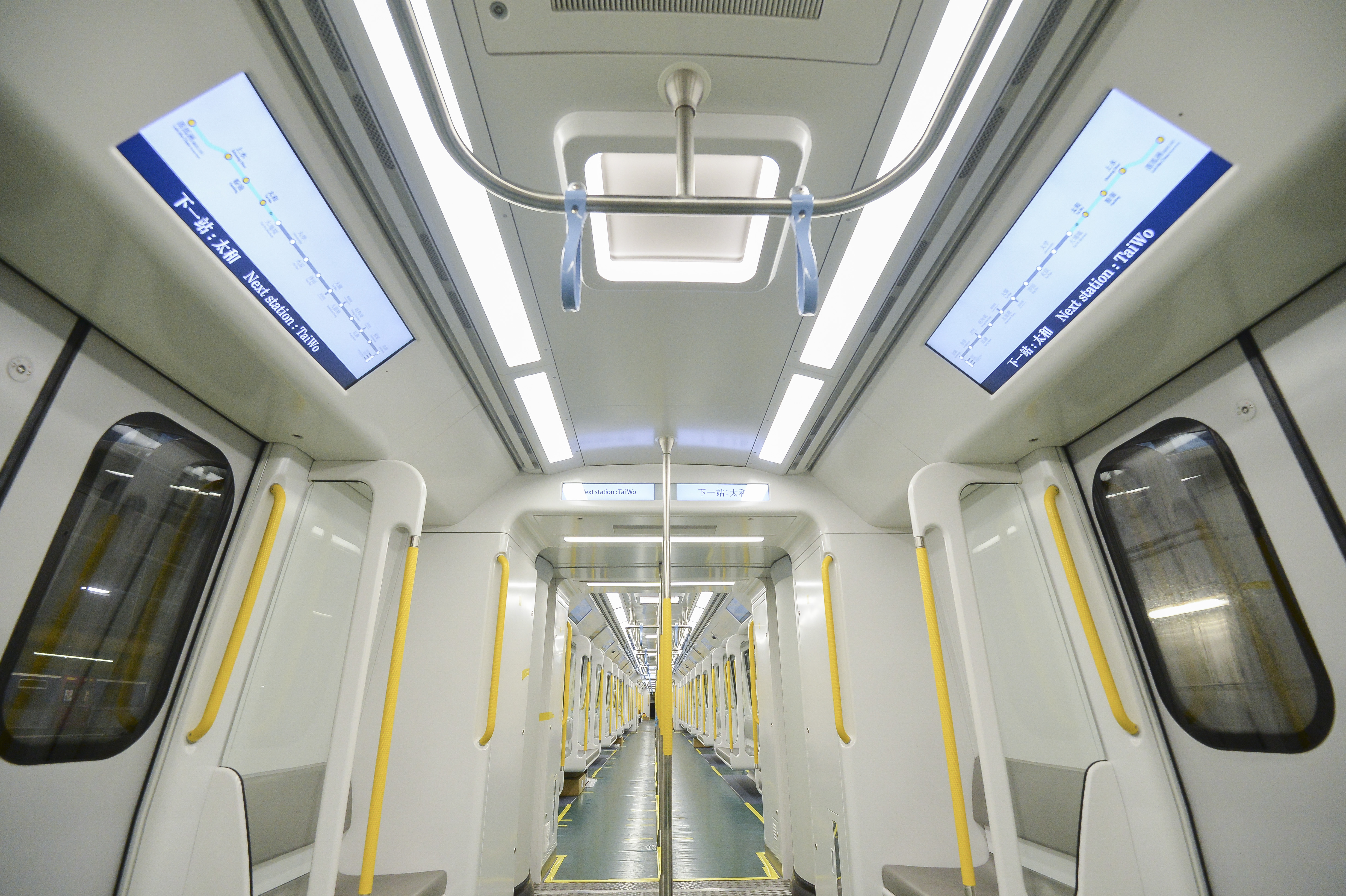 R-Stock採用動態路線圖及通道端螢幕,扶手吊環以塑膠製造。港鐵公司提供圖片。