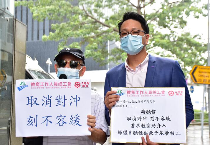工聯會屬會教育工作人員總工會今日(11日)与一名退休校工到政總請願,指事主葉先生申訴其任職資助學校和教育局疑濫用自願性供款,當他被強制退休時,用作抵銷長期服務金。