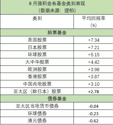债券基金以外,8月股票及货币基金等均录正回报。400多只基金表现排名榜上,位列榜首为宏利环球精选计划的宏利MPF北美股票基金,回报升8.43%。