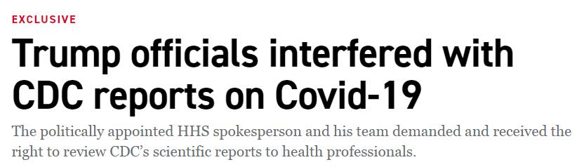 但是,自从没有医学和科学背景的前特朗普竞选官员迈克尔·卡普托(Michael Caputo)于今年4月被任命为美国卫生及公共服务部新发言人以来,该部门做出了大量努力使这些报告与特朗普的声明保持一致。卡普托和他的助手还试图推迟甚至完全停止CDC一些报告的发布。在Politico获取的一封卡普托的顾问保罗·亚历山大博士8月8日发送的一封电子邮件中,亚历山大写道:“疾控中心似乎正在写一些批评政府的报告”。他随后表示希望雷德菲尔德修改报告内容。