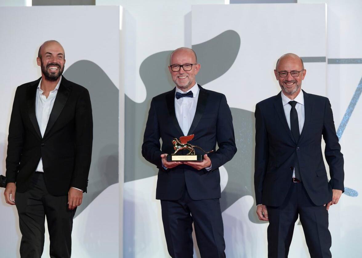 2020年9月12日,在以冠状病毒大流行为背景的威尼斯电影节上,由赵婷执导的《荒原》获得了最佳影片金狮奖。图为迪士尼意大利市场总监戴维·罗姆尼(中)代表《荒原》剧组领取最佳影片金狮奖。