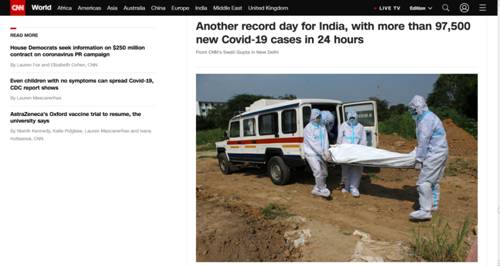 CNN报道称,印度的确诊病例总数已达465万例,其中超过95万例(958316)为现有确诊病例,康复患者总数超过360万,死亡77472例。