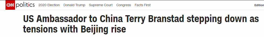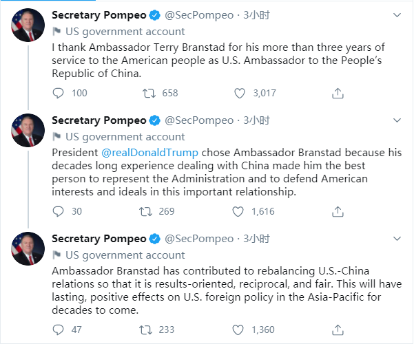 当地时间14日凌晨,美国国务卿蓬佩奥连发三推感谢、称讃美驻华大使布兰斯塔德。随後,美国哥伦比亚广播公司(CBS)援引蓬佩奥的推文报道称,美国驻华大使将「换人」。美国媒体猜测,蓬佩奥的推文暗示着布兰斯塔德大使将离任。