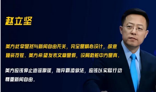赵立坚称,「请问在座的外国媒体朋友,如果中国政府像美方一样,今天向你们提供一篇严重扭曲事实和对你们国家攻击抹黑的文章,要求你们明天答覆并承诺不能做任何修改、全文刊发,你们能做到吗?」他进一步指出,美方此举显然与新闻自由无关,完全是精心设计,故意碰瓷找茬。