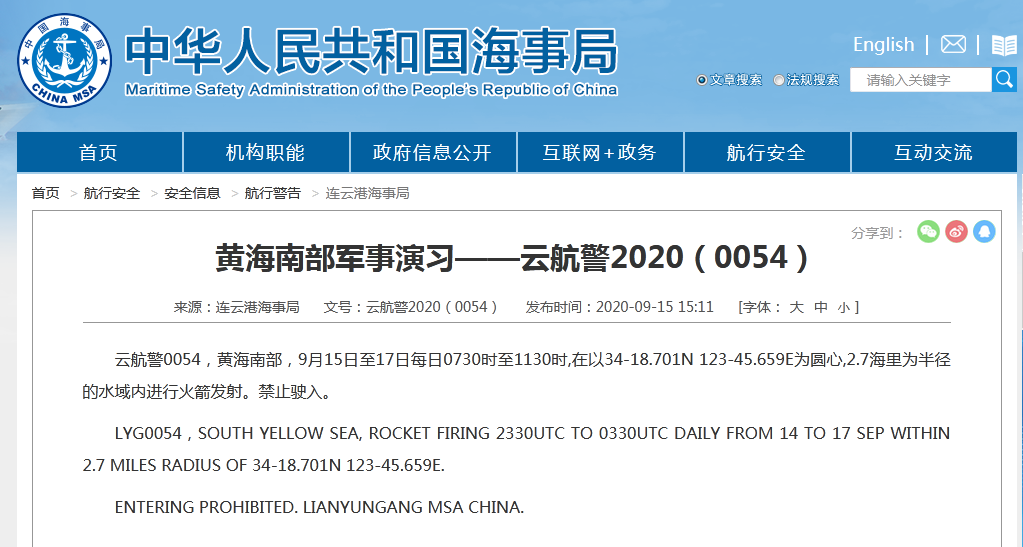 据连雲港海事局今日发布航行警告,信息显示,雲航警0054,黄海南部,9月15日至17日每日0730时至1130时,在以34-18.701N 123-45.659E为圆心,2.7海里为半径的水域内进行火箭发射。禁止驶入。