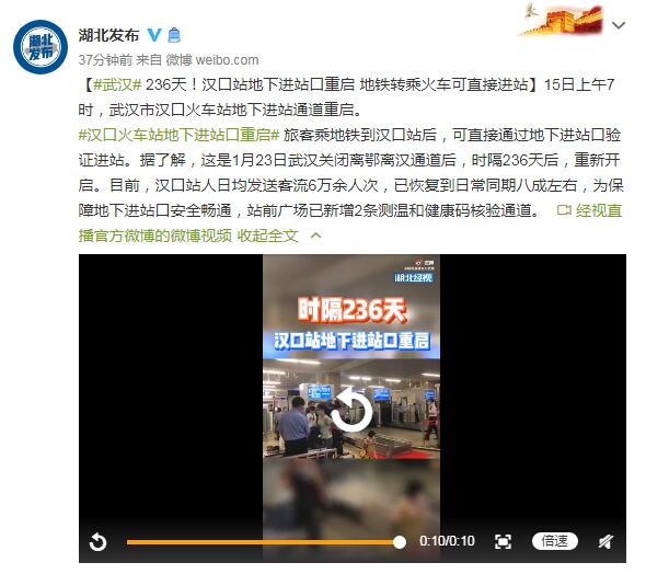 据湖北省人民政府新闻办公室官方微博“湖北发布”消息,15日上午7时,湖北省武汉市汉口火车站地下进站通道重启。