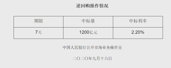 为维护银行体系流动性合理充裕,2020年9月16日人民银行以利率招标方式开展了1200亿元逆回购操作。具体情况如下: