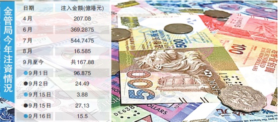 踏入9月至今,金管局已五度沽出港元,涉及資金167.88億港元。由於港匯連日徘徊於7.75強方兌換保證價,金管局連續數日入市,周一晚在紐約市場尾段(即15日香港時間)觸發7.75元強方兌換保證,金管局入市承接美元沽盤,向市場注入3.88億港元資金,以捍衛聯繫匯率制度,維持港元穩定,令昨日本港銀行體系總結餘增至2066.96億元。