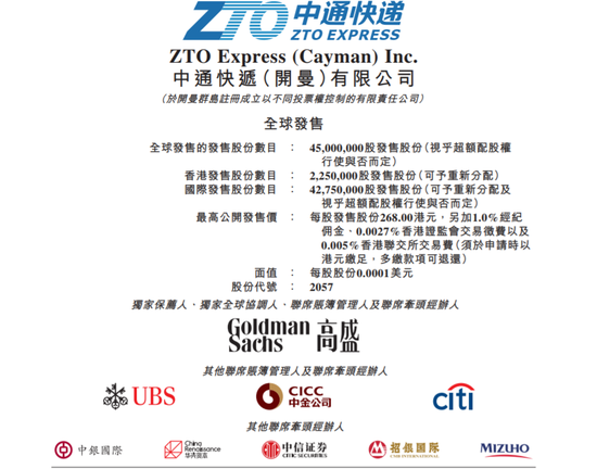 物流服务商中通快递(02057.HK)今日(17日)开始招股,全球一共发售4500万股,其中香港公开发售占5%,招股价最高为268港元,最高集资额为120.6亿元。每手买卖单位为50股,计及手续费,每手入场费约为13535元。招股在下星期二(22日)结束,预计本月29日在联交所买卖。