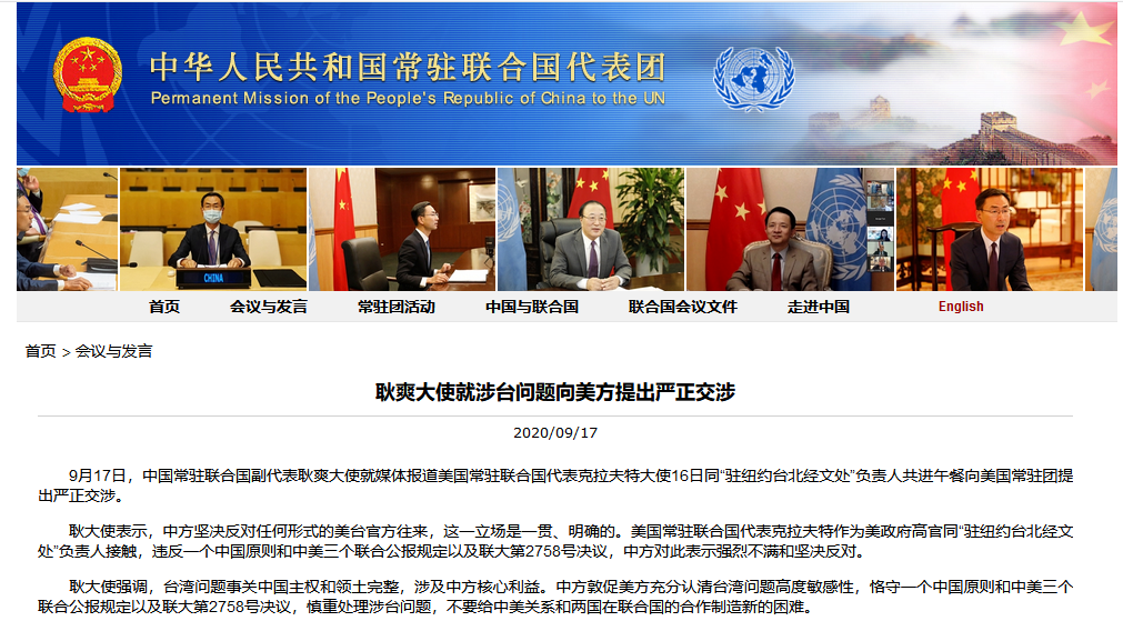 据中国常驻联合国代表团网站消息,9月17日,中国常驻联合国副代表耿爽大使就媒体报道美国常驻联合国代表克拉夫特大使16日同「驻纽约台北经文处」负责人共进午餐向美国常驻团提出严正交涉。
