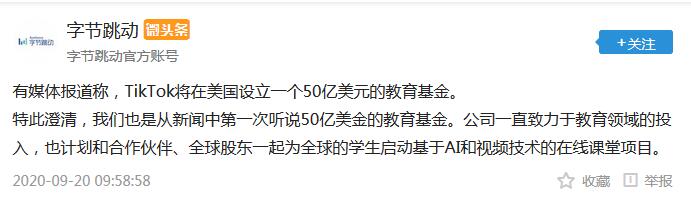20日,內地與海外媒體均有報道指,TikTok母公司字節跳動(ByteDance)當天發聲明指出,「有媒體報道稱,TikTok將在美國設立一個50億美元的教育基金。特此澄清,我們也是從新聞中第一次聽說50億美元的教育基金。」字節跳動又指,公司一直致力於教育領域的投入,亦計劃和合作夥伴、全球股東一起為全球的學生啟動基於人工智能和視頻技術的線上課堂項目。
