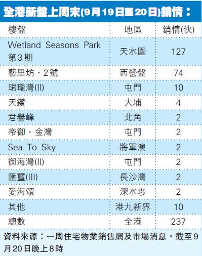 新地(016)旗下天水圍項目Wetland Seasons Park第3期周六(19日)銷售首輪133伙,售出約95%單位,發展商周日再加推38伙。另外,以低於今年初第1期呎價7.9%推出的恒地(012)旗下西營盤藝里坊‧2號周六開售80伙,消息指,全日售出74伙,銷售率約93%,周日更加推第3號價單,涉68伙。
