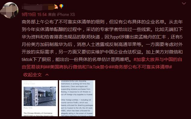 据新华社19日消息, 根据《中华人民共和国对外贸易法》《中华人民共和国国家安全法》等法律法规的规定,《不可靠实体清单规定》已经完成立法程序。经国务院批准,《不可靠实体清单规定》已于9月19日在商务部网站公布。