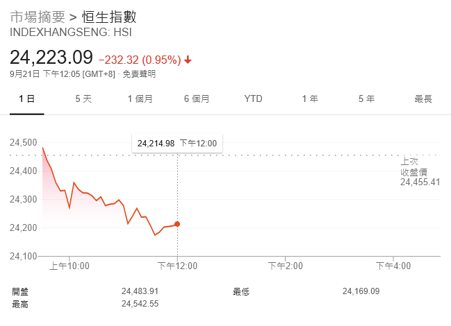 恒指半日跌232點,中午收報24223點。滙豐(00005)破底曾跌逾4%,一度跌穿30元水平,低見29.6元,半日跌2.9%報30.05元。騰訊(00700)跌逾1%。濠賭股向下,銀娛(00027)、金沙(01928)跌逾3%。