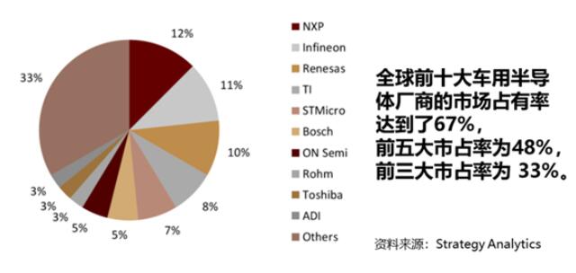 Strategy Analytics数据显示,全球前十大车用半导体厂商的市场占有率达到了67%,前五大市占率为48%,前三大市占率为33%。