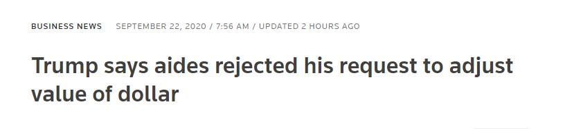 特朗普在俄亥俄州出席集會時向支持者表示,他的政策正在挽救俄亥俄州就業機會,曾對官員提出稍微調整一下美元汇率以抵消他所说的中方「操纵」的人民币汇率,但對方指不可能,因美元滙率必須自由浮動。