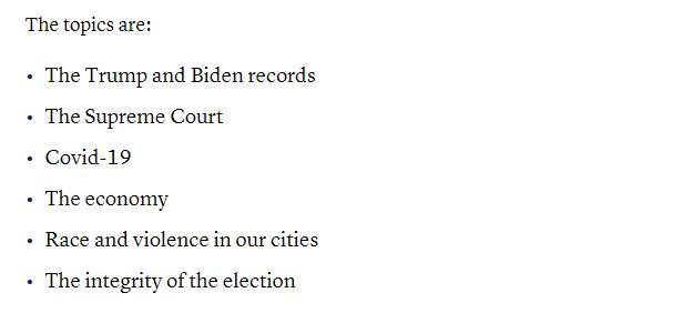 6個辯論議題包括兩人的往績、最高法院、疫情、經濟、種族與暴力,以及選舉誠信等問題。委員會又指會留意新聞發展檢視各項議題並作出調整。第二和第三場辯論則會在下月舉行。