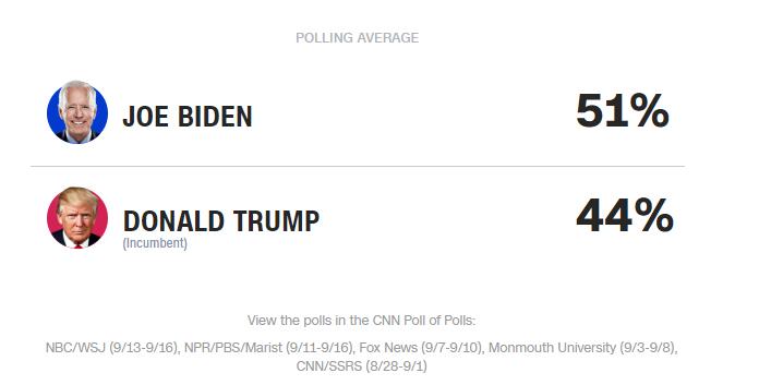 另外据美国有線電視新聞網(CNN),民调显示拜登的支持度(51%)領先特朗普(44%)約7個百分點。