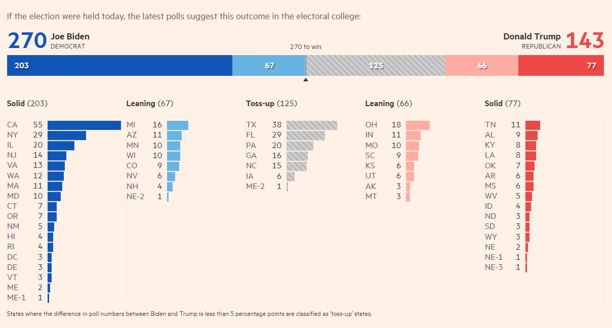 据金融時報民调显示,拜登支持度亦领先特朗普。
