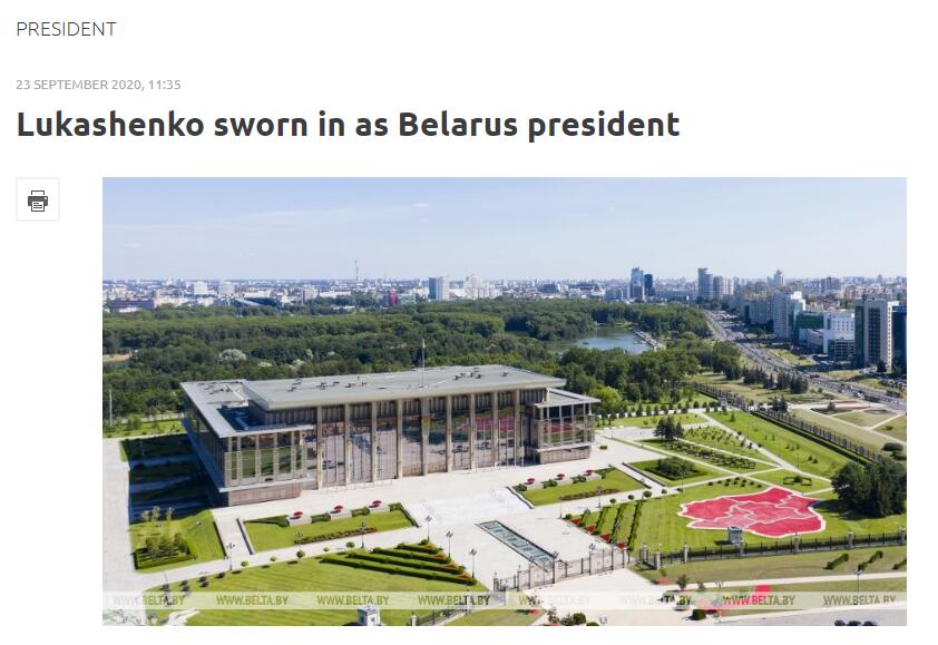 据白通社消息,当地时间9月23日,白俄罗斯当选总统卢卡申科在首都明斯克的独立宫举行就职典礼。