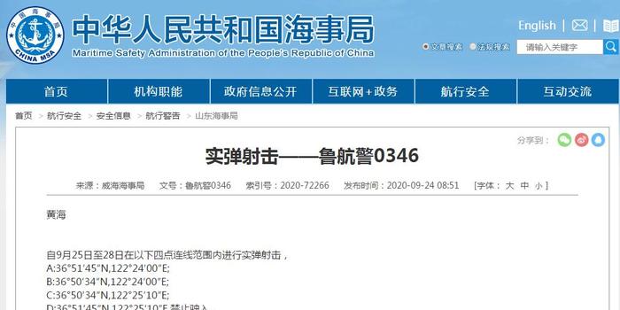 據威海海事局9月24日消息,自9月25日至28日在以下四點連線範圍內進行實彈射擊:
