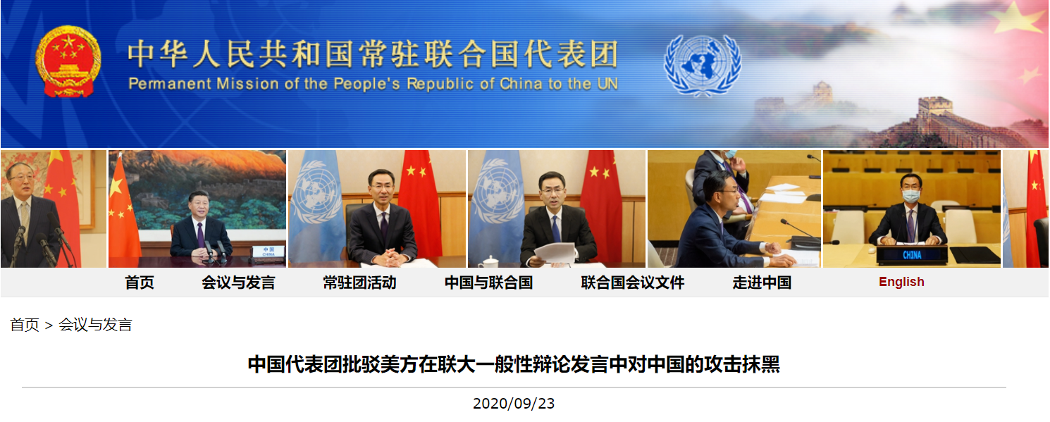 中國代表團稱,美國在第75屆聯大一般性辯論上罔顧基本事實,對中國進行攻擊抹黑,中方對此堅決反對。