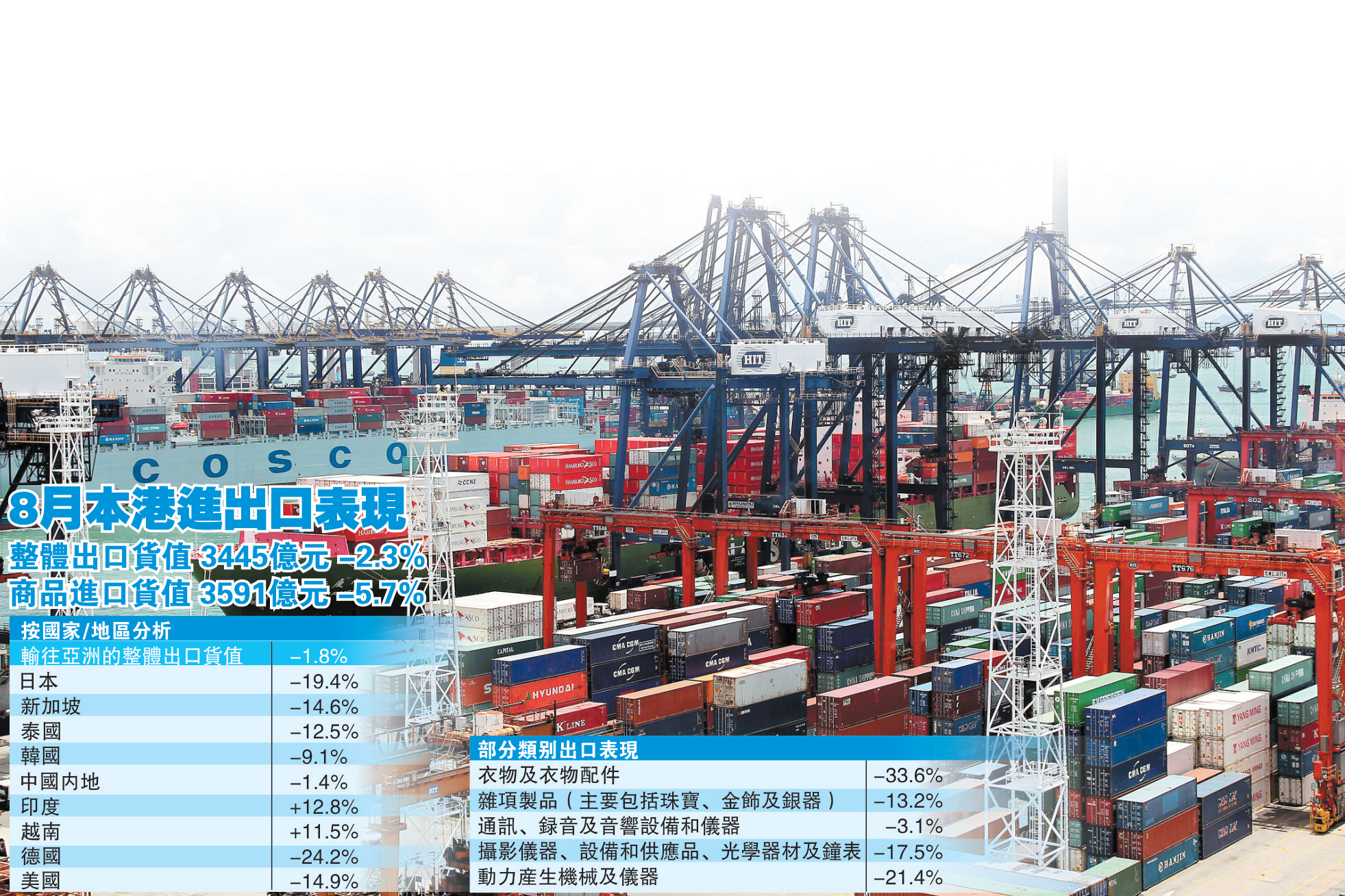最新外貿數據顯示,本港今年8月份商品整體出口貨值為3445億元,較2019年同月下跌2.3%(6個月連跌),略勝於市場預期的下跌3%。同時,繼今年7月份錄得3.4%的按年跌幅後,8月份商品進口貨值為3591億元,較去年同月下跌5.7%(連跌21個月)。