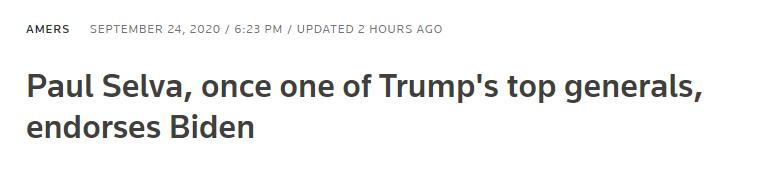 据路透社報道,480多名美國國防部前高層和國家安全專家,簽署公開信支持民主黨總統候選人拜登,包括特朗普政府前資深軍事顧問,前參謀長聯席會議副主席兼退休上將塞爾瓦。