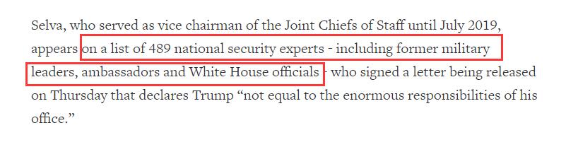 除塞爾瓦外,簽名的還有前海军上将保罗·祖库夫特(Paul Zukunft)(2014年至2018年担任海岸警卫队司令),他表示自己不是共和黨人,亦不是民主黨人,表示重點是國家的基本價值觀受到損害。