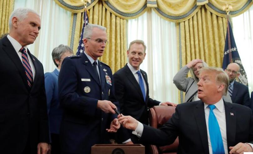 特朗普2019年2月19日在签署文件后,将笔交给时任美国空军参谋长联席会议副主席的保罗·塞尔瓦。(路透社)