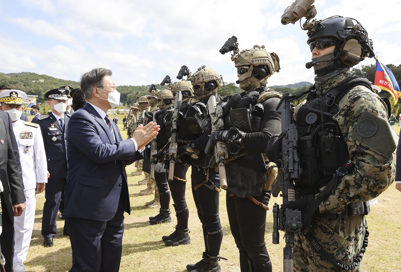 文在寅25日視察特種戰備部隊,並表示要時刻加強戒備。美聯社