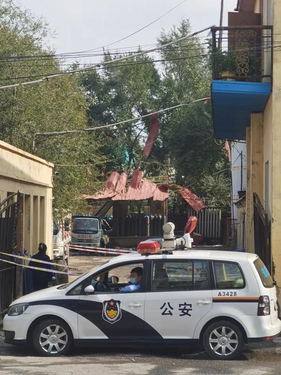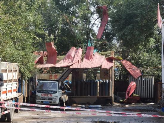 入口处拉起警戒线,从入口可见院内有一处铁皮遮雨凉亭,凉亭下方放有很多蓝色罐体,凉亭的铁皮已被掀开,有的脱离地面。