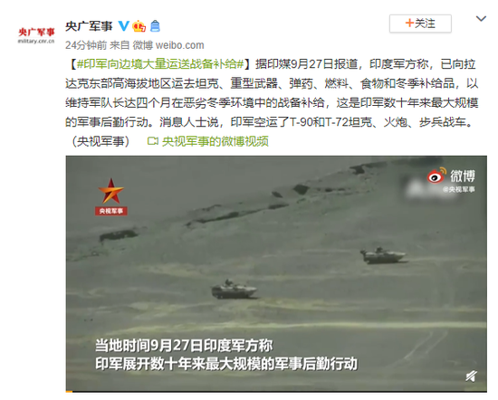 據印度亚洲国际新闻台9月27日報道,印度軍方稱,已向拉達克東部高海拔地區運去坦克、重型武器、彈藥、燃料、食物和冬季補給品,以維持軍隊長達四個月在惡劣冬季環境中的戰備補給,這是印軍數十年來最大規模的軍事後勤行動。消息人士說,印軍空運了能夠在零下40度作戰的T-90和T-72坦克、火炮、步兵戰車。