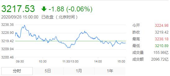 截止收盘,沪指报3217.53点,跌0.06%,成交额为2097亿元(上一交易日成交额为2207亿元);深成指报12760.93点,跌0.42%,成交额为3306亿元(上一交易日成交额为3487亿元);创指报2521.25点,跌0.75%,成交额为1596亿元(上一交易日成交额为1714亿元)。两市成交额创5月27日以来新低;北向资金尾盘转为净流入。