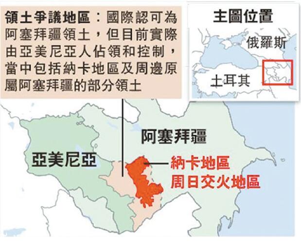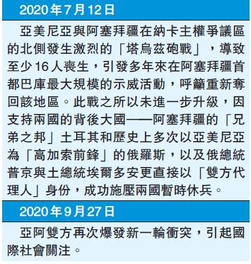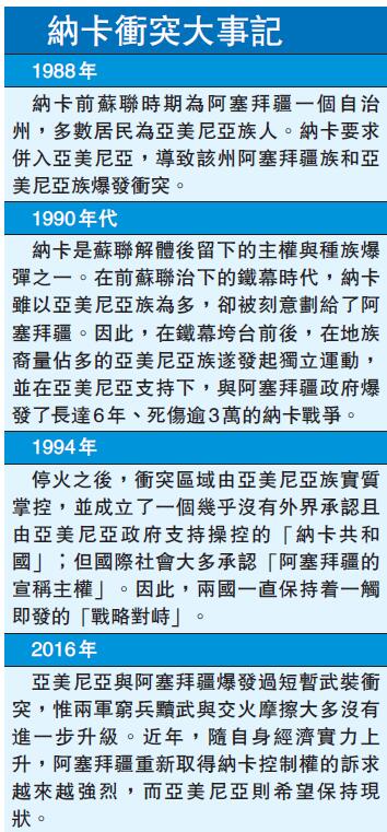 亞美尼亞和阿塞拜疆當地時間周日在納卡地區爆發新一輪衝突,雙方均指責對方違反停火協議,率先發動軍事進攻。衝突昨踏入第二日,阿國防部表示,在衝突中亞美尼亞共有550名士兵陣亡,而阿塞拜疆則有約200名士兵陣亡。亞美尼亞駐俄羅斯大使同日表示,土耳其已從敘利亞北部向阿塞拜疆派出約4000名士兵,並參與進攻納卡。