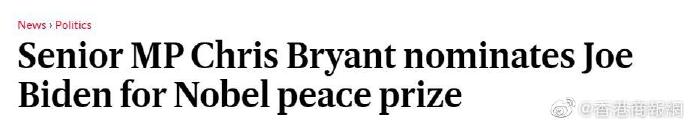 「今日俄羅斯」(RT)29日最新消息稱,英國反對黨工黨議員克里斯•布萊恩特提名美國民主黨總統候選人喬•拜登獲諾貝爾和平獎,理由是拜登在席捲全美的暴力抗議中緩解了政治緊張局勢。