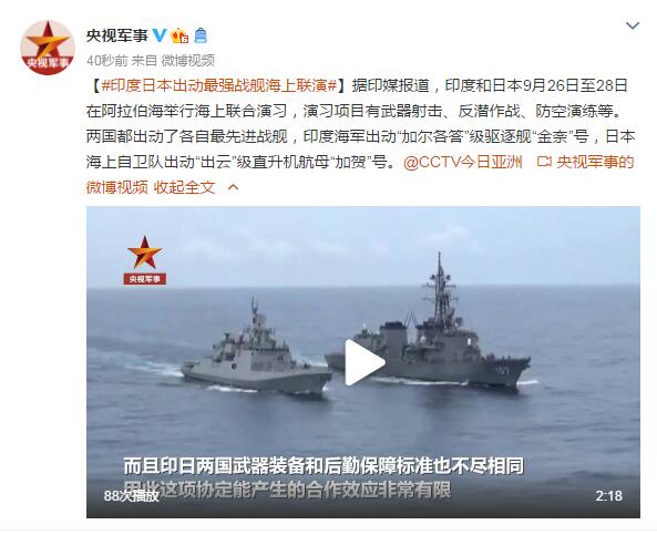 據印媒報道,印度和日本9月26日至28日在阿拉伯海舉行海上聯合演習,演習項目有武器射擊、反潛作戰、防空演練等。兩國都出動了各自最先進戰艦,印度海軍出動「加爾各答」級驅逐艦「金奈」號,日本海上自衛隊出動「出雲」級直升機航母「加賀」號。