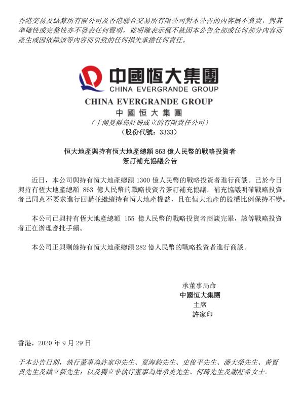 9月29日,恒大地產與1300億戰投中的863億戰投簽訂補充協定,戰投同意轉為普通股權長期持有,且股權比例保持不變。剩餘的437億戰投中,恒大已與155億戰投商談完畢,目前正在辦理手續,282億戰投正在商談中。